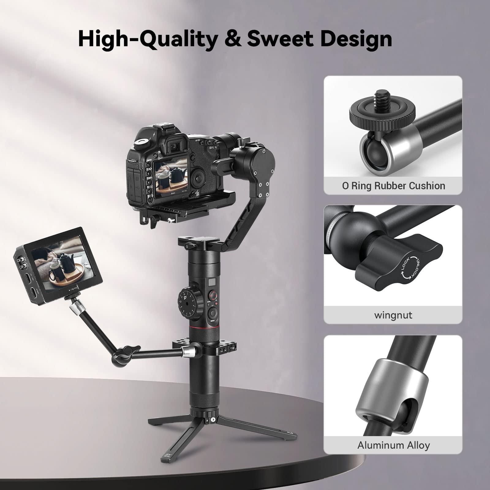 - 【RUBBER & THREAD】Mounted with 1/4″ screw is a O ring rubber cushion which could prevent the scratches of monitor and help to lock the monitor tighter.