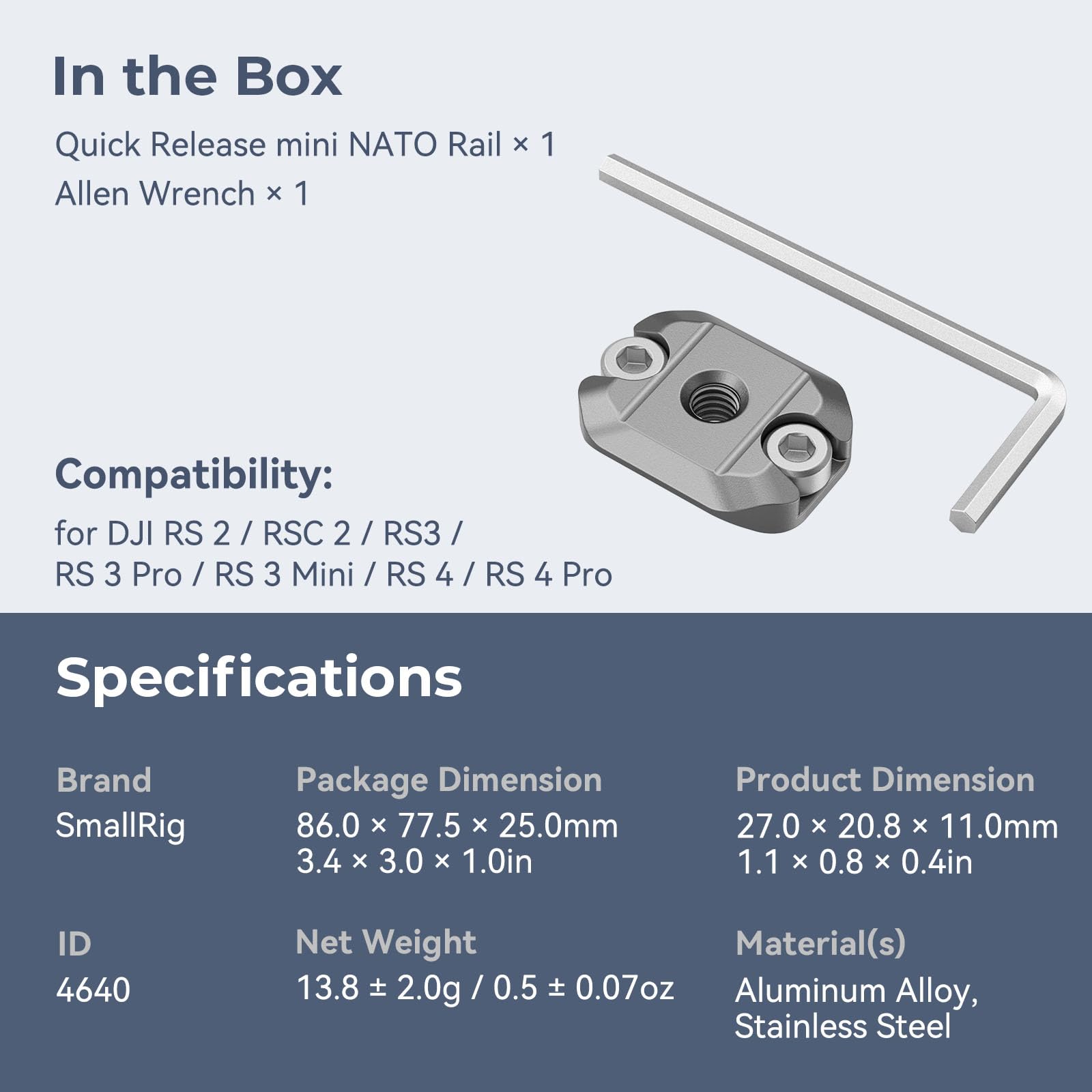 - For DJI Selected Gimbal: SmallRig HawkLock H21 Quick Release Mini NATO Rail 4640 is specifically designed for DJI RS 4 Mini/ RS 2 / RSC 2 / RS3 / RS 3 Pro / RS 3 Mini / RS 4 / RS 4 Pro. It is conveniently connected to the magic arm and monitor mount.