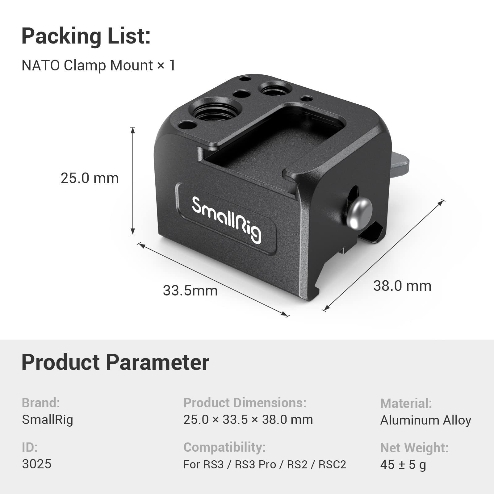 - 【FOR DJI RS 4 Mini/ RS 2 / RSC 2 / RS 3 / RS 3 Pro / RS 3 mini / RS 4 / RS 4 Pro】SmallRig NATO Clamp Accessory Mount 3025 is specially designed for DJI RS 4 Mini/ RS 2 / RSC 2 / RS 3 / RS 3 Pro / RS 3 mini / RS 4 / RS 4 Pro, which is for attaching a monitor, microphone, or wireless devices on the side of the stabilizer.