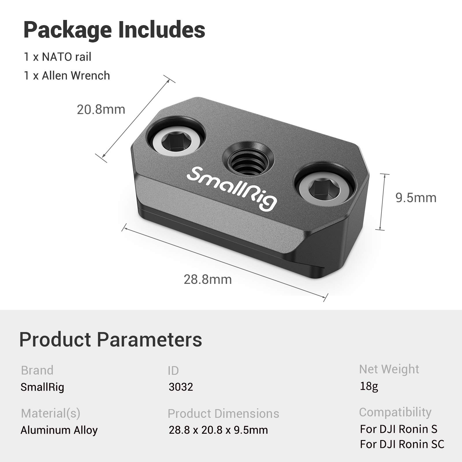 - 【FOR DJI AND SMALLRIG RS 2/RSC 2 ACCESSORIES WHICH EQUIPPED WITH NATO PORT】SmallRig NATO Rail 3032 is designed to mount DJI & SmallRig RS 2/ RSC 2 accessories with NATO port on two sides of Ronin S/SC gimbal, like the NATO Clamp Mount 3025, Monitor Mount 3026, Dual Handgrip 3027 and Sling Handle 3028, as well as for DJI original RS 2 dual handgrip.