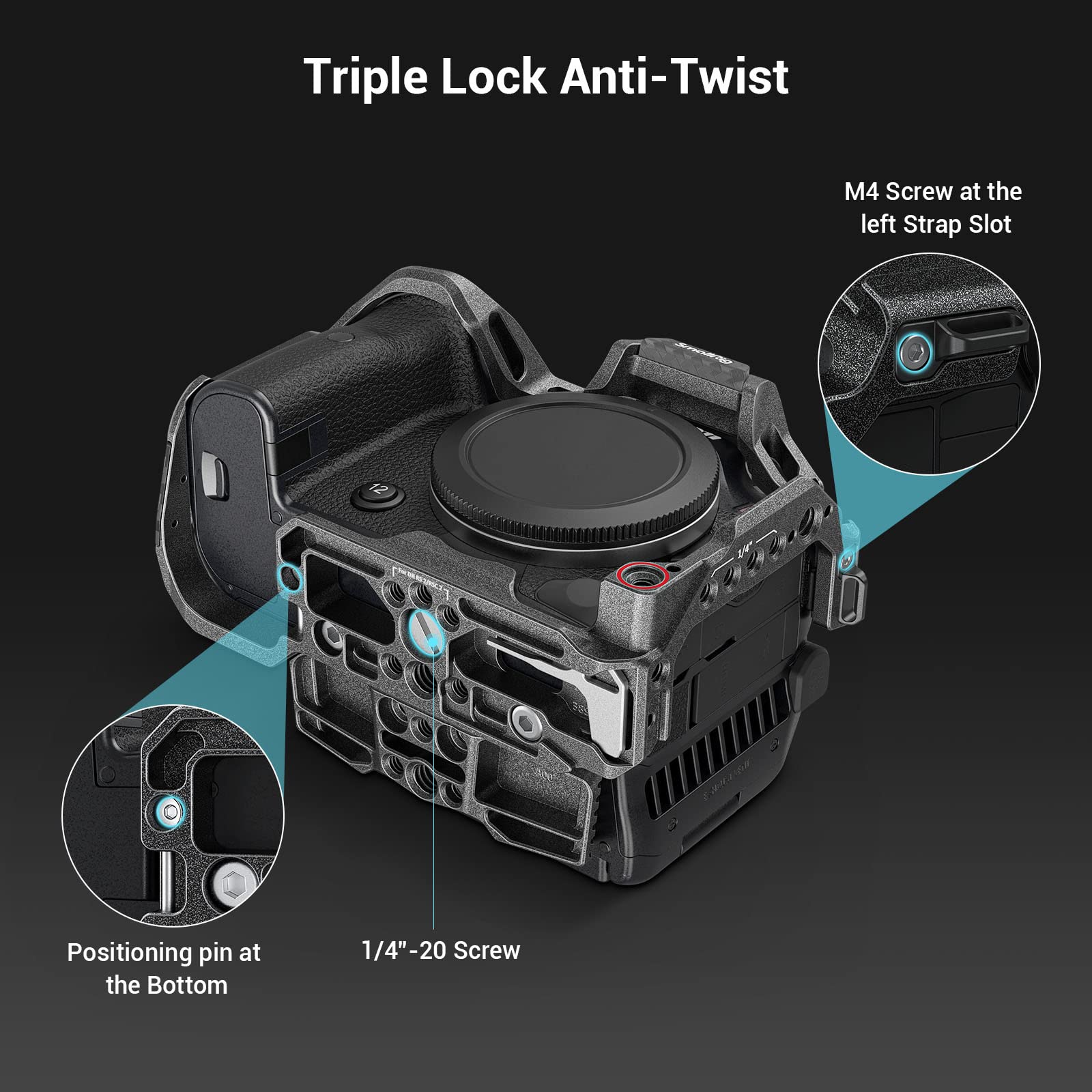 - 【Better Security and Stability】Triple lock tightly via a 1/4”-20 screw, a positioning pin at the bottom, and an M4 screw at the left strap slot are used to prevent your camera from twisting. In addition, the thumb-screw for HDMI & USB-C cable clamp can prevent accidental disconnection and ensure stable signal transmission.