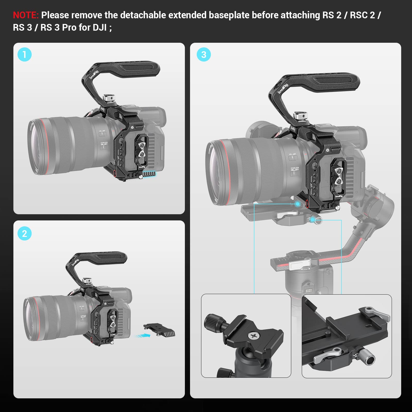 - 【Multi-scene Shooting】For stabilizer, the bottom plate for Arca swiss enables access or disassembly easily on RS 2/RSC 2/ RS 3 / RS 3 Pro for DJI. When tripod shooting, you can add the detachable extended baseplate to make the camera more stable. Also, the cage includes an Allen wrench for easy access and disassembly. Note: Please remove the detachable extended baseplate before attaching RS 2/RSC 2/ RS 3 / RS 3 Pro for DJI.