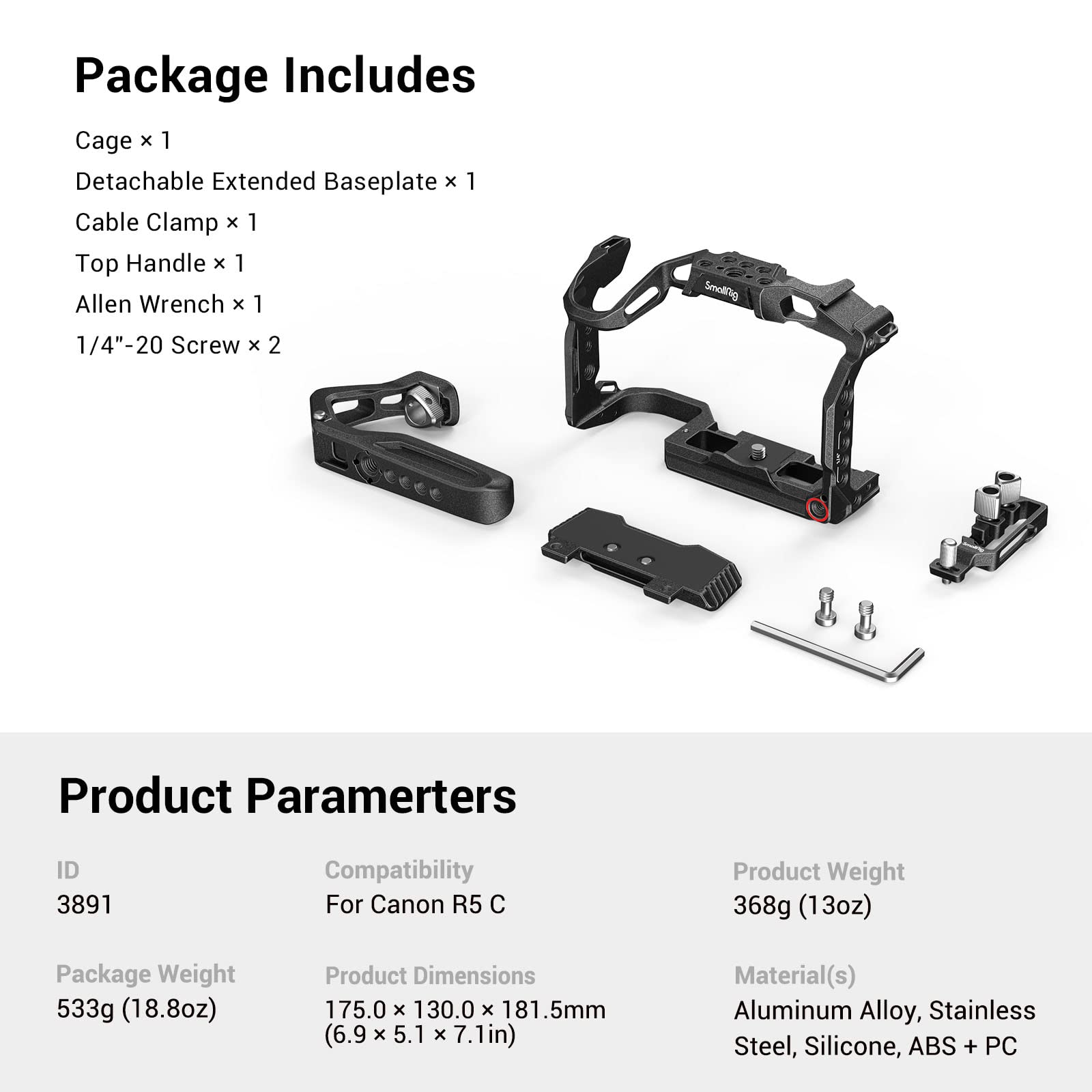 - 【For Canon R5C】The handheld kit 3891 includes a top handle, a thumb-screw for HDMI & USB-C cable clamp, and a full cage specifically designed for Canon R5 C. Protecting the camera body while giving full access to camera buttons beside the front remote-control port of the camera and bringing a comfortable and stable shooting experience. The ergonomically-designed top handle feels comfortable and facilitates low-angle shots and camera movement.