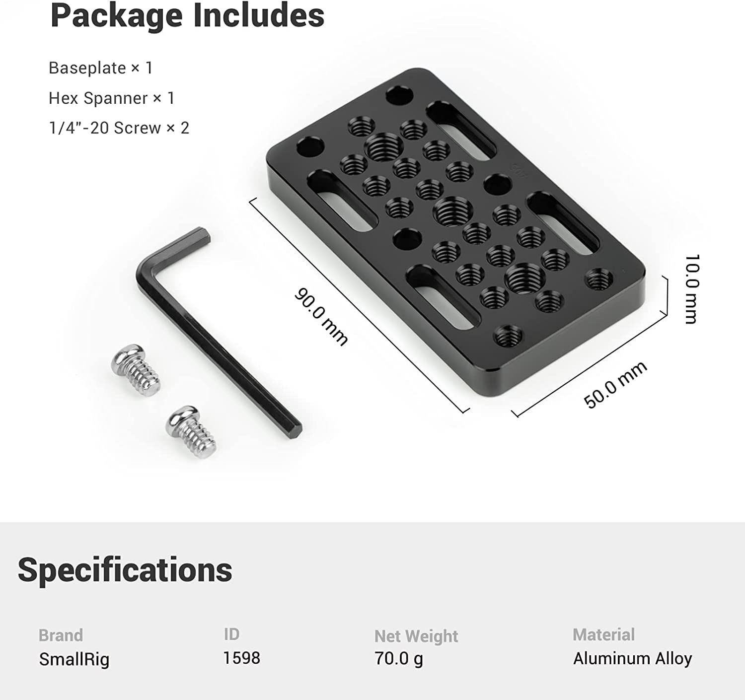 - 【Product Information】Dimension: 90*50*10mm/3.54*1.96*0.39″; Net Weight: 70g/2.46oz; Package Includes: 1 x Baseplate, 2 x 1/4″ Screw, 1 x Hex Spanner; Material(s): Aluminum Alloy;